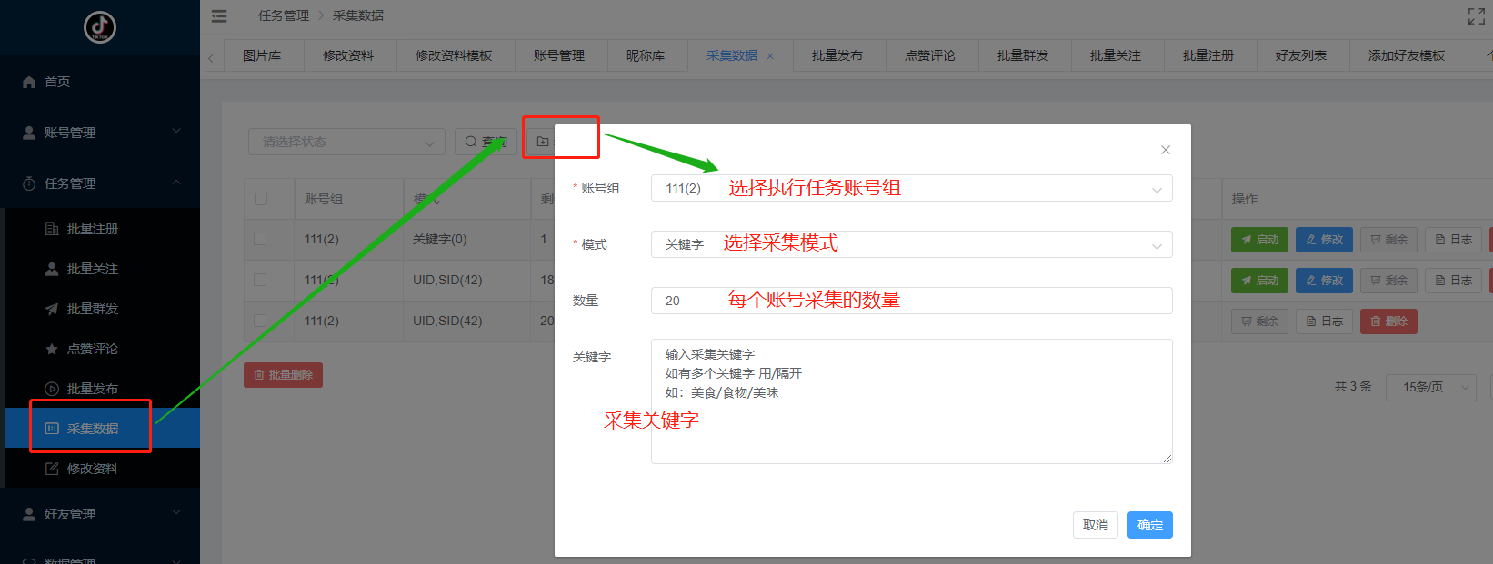 点击“任务管理”—采集数据—新增关键字采集任务—启动 (多个关键字用 / 隔开)