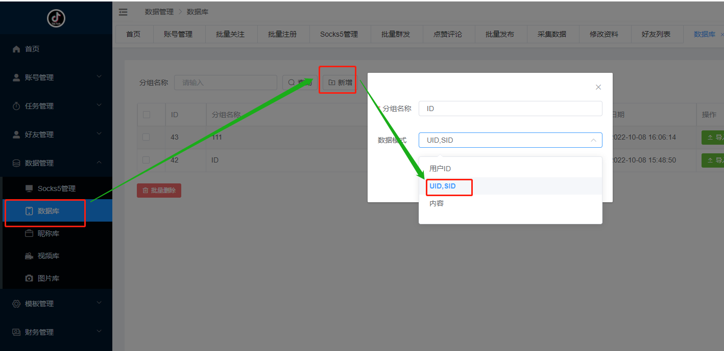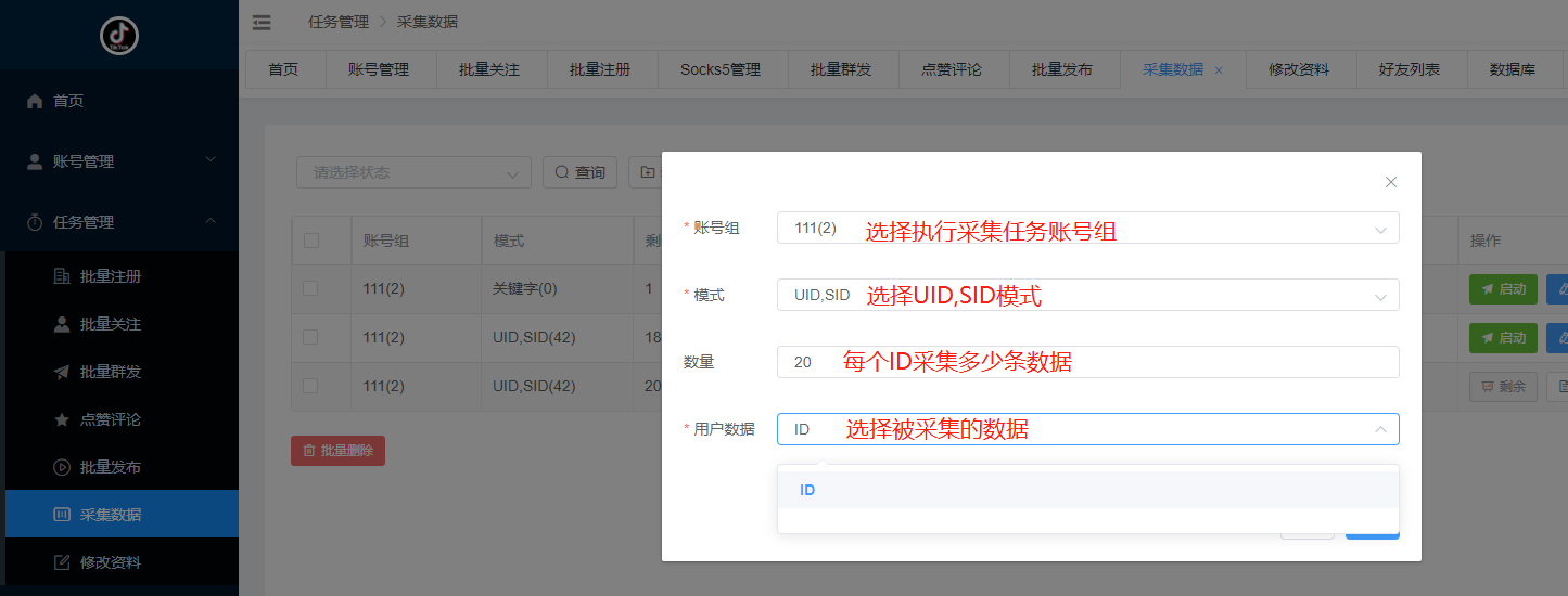 2):任务管理—采集数据—新增UID,SID采集任务—启动