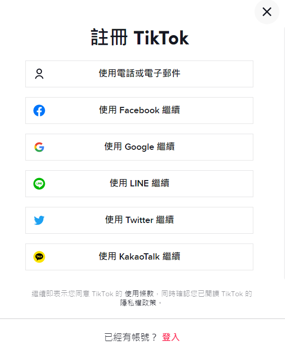 打开 https://www.tiktok.com/ 我们可以看到有6种注册方式,分别是邮箱、境外手机号、Facebook、Google、Line、Twitter、KakaoTalk。