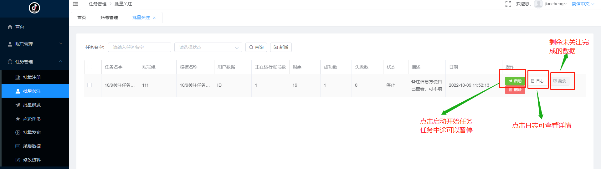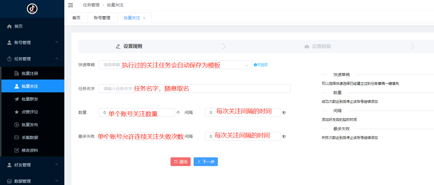 任务管理—批量关注—新增任务—启动